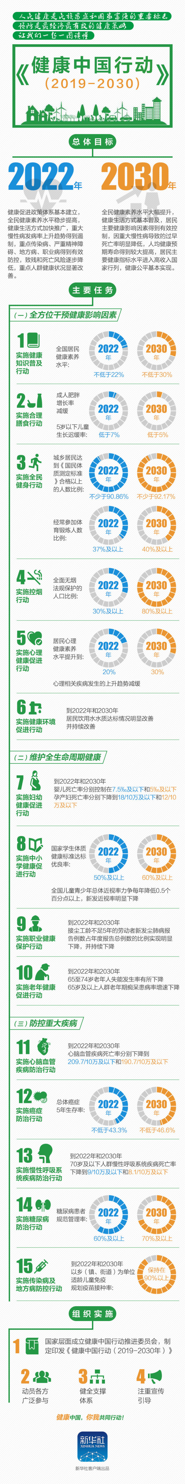 ?。ㄒ唬┘訌娊M織領(lǐng)導。國家層面成立健康中國行動推進委員會,制定印發(fā)《健康中國行動(2019-2030年)》,細化上述15個專項行動的目標、指標、任務和職責分工,統(tǒng)籌指導各地區(qū)各相關(guān)部門加強協(xié)作,研究疾病的綜合防治策略,做好監(jiān)測考核。要根據(jù)醫(yī)學進步和相關(guān)技術(shù)發(fā)展等情況,適時組織修訂完善《健康中國行動(2019-2030年)》內(nèi)容。各地區(qū)要結(jié)合實際健全領(lǐng)導推進工作機制,研究制定實施方案,逐項抓好任務落實。各相關(guān)部門要按照職責分工,將預防為主、防病在先融入各項政策舉措中,研究具體政策措施,推動落實重點任務。