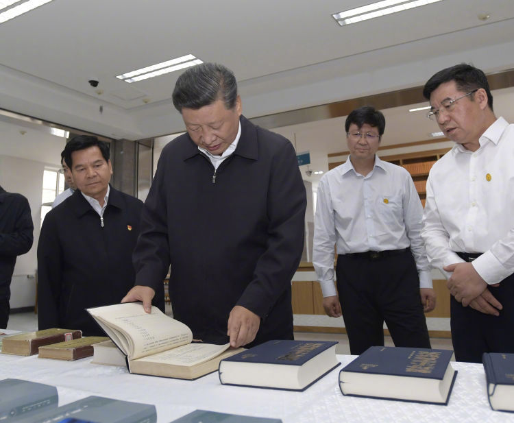 蒙古文古籍展閱室收藏了眾多歷史文化典籍,記載了蒙古族文化與其他民族文化融合發(fā)展的歷史。習(xí)近平總書記認(rèn)真聽講解,不時駐足端詳。