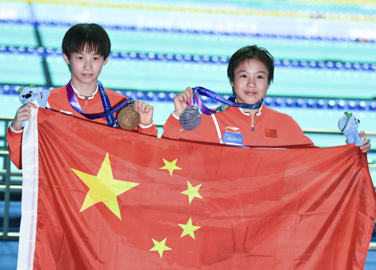 7月17日,中國選手陳芋汐(左)和盧為在頒獎儀式后合影。新華社記者 夏一方 攝
