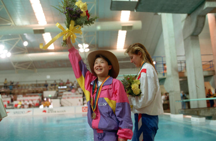 伏明霞在1991年第六屆世界游泳錦標賽女子跳臺跳水比賽中獲冠軍。新華社記者 程至善 攝