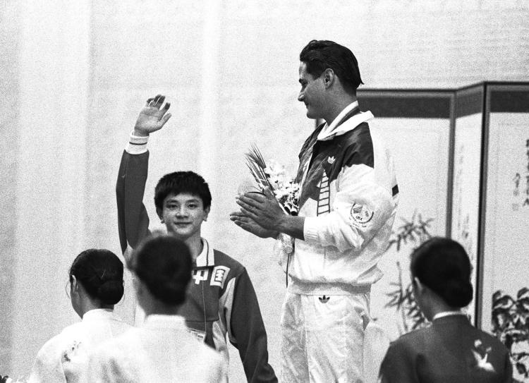 1988年9月27日,獲第24屆奧運會男子跳臺跳水銀牌的中國選手熊倪在領(lǐng)獎臺上向觀眾致意。新華社記者 韓居策 攝