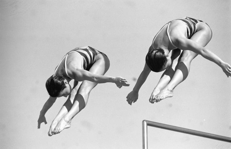 1995年5月14日,熊敏和郭晶晶(左)在美國佛羅里達州勞德代爾堡舉行的“阿拉莫國際跳水系列大獎賽”美國站比賽中。新華社記者 宋曉剛 攝