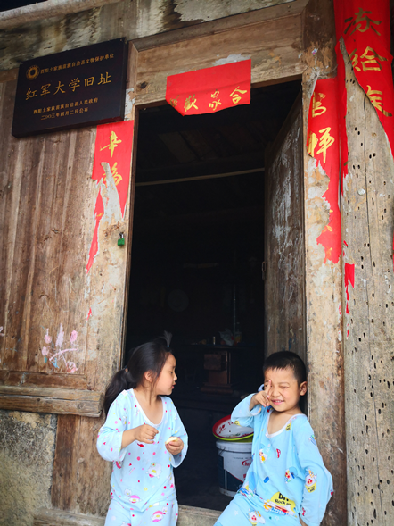 告別了土地廟,沿著紅軍街繼續(xù)東行,上一道坡來(lái)到紅軍大學(xué)遺址。這座普通的民房雖然掛著文物的標(biāo)識(shí),如今還有人家居住在此。一個(gè)4歲的小男孩和他6歲的姐姐坐在門(mén)檻上看著我們,小女孩有點(diǎn)害羞,小男孩說(shuō)話干脆利落。我倆有了如下對(duì)話: