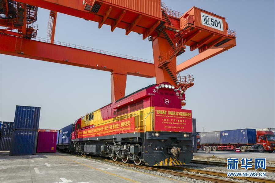 在中鐵聯(lián)集重慶中心站內(nèi),“陸海新通道”鐵海聯(lián)運出口印度尼西亞的首趟專列準備發(fā)車(2019年4月26日攝)。新華社記者 劉潺 攝