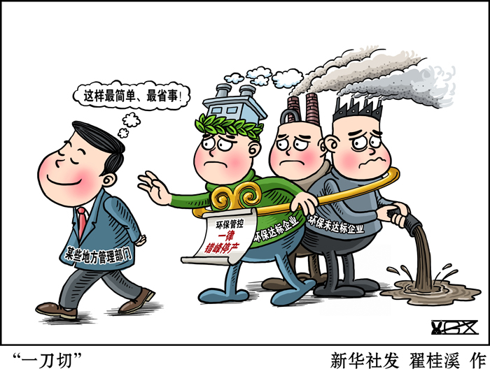 值得注意的是,有些地方“一刀切”政策開(kāi)始搞移花接木。中部多家企業(yè)的相關(guān)負(fù)責(zé)人反映,遇到上級(jí)部門前來(lái)檢查、督查時(shí),地方政府擔(dān)心指標(biāo)不符合要求,就讓企業(yè)一律采取停產(chǎn)應(yīng)對(duì)??稍趯?duì)外發(fā)布消息時(shí),卻說(shuō)成“企業(yè)停產(chǎn)檢修”“企業(yè)升級(jí)改造設(shè)備”,本是地方的“一刀切”要求,卻搖身一變成為企業(yè)的“自行選擇”。