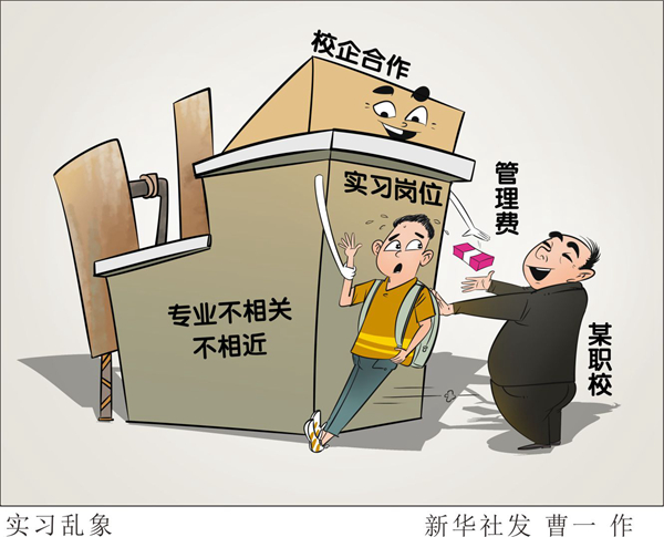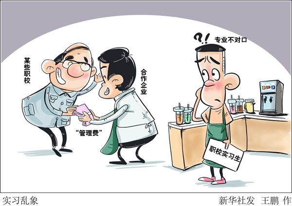 學(xué)機(jī)電工程的卻被安排去賣飲料,送一名學(xué)生去企業(yè)“實習(xí)”能拿上千元“管理費(fèi)”……實習(xí)本是職業(yè)學(xué)校技能人才培養(yǎng)的重要一環(huán),但記者調(diào)查發(fā)現(xiàn),有的職校隨意安排與專業(yè)不相關(guān)、不相近的實習(xí)崗位,有的職校把學(xué)生當(dāng)成廉價勞動力“出賣”給企業(yè)。