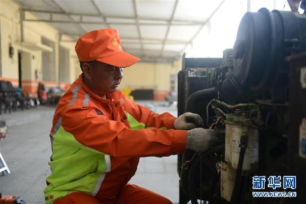 青海省湟源公路段湟源工區(qū)職工方萬品在車間內(nèi)檢修發(fā)電機(jī)(7月29日攝)。新華社發(fā)(王浡 攝)