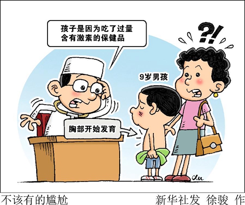 “起初是孩子不愿意去上游泳課了,也不說原因。直到有一次出去吃飯時,孩子把湯倒在了身上,卻死活不讓我脫上衣,才發(fā)現(xiàn)孩子的乳房竟然發(fā)育了。”浩浩媽媽李女士告訴記者,經(jīng)兒科醫(yī)生診斷,是因為吃了不少補鋅的保健品導致激素紊亂,生長加速。
