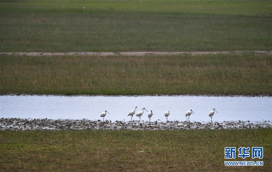 在位于江蘇鹽城東部沿海的大豐麋鹿國家級自然保護區(qū),一群黑臉琵鷺在水邊棲息(6月27日攝)。新華社記者 李響 攝