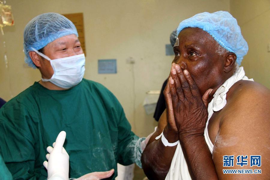 2010年11月23日,在津巴布韋首都哈拉雷郊區(qū)的奇通圭扎中心醫(yī)院,一位老人(右)在中國(guó)“非洲光明行”醫(yī)療隊(duì)為其實(shí)施復(fù)明手術(shù)后重見(jiàn)光明,驚喜萬(wàn)分。 新華社記者 李平 攝