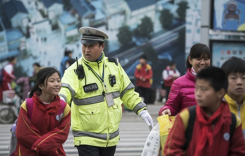 一位輔警在護(hù)送學(xué)生過(guò)馬路。陶明 攝