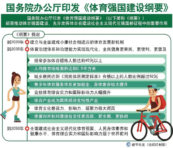 《綱要》提出,到2020年,建立與全面建成小康社會相適應(yīng)的體育發(fā)展新機制。到2035年,體育治理體系和治理能力實現(xiàn)現(xiàn)代化,全民健身更親民、更便利、更普及,經(jīng)常參加體育鍛煉人數(shù)達到45%以上,人均體育場地面積達到2.5平方米,城鄉(xiāng)居民達到《國民體質(zhì)測定標準》合格以上的人數(shù)比例超過92%;青少年體育服務(wù)體系更加健全,身體素養(yǎng)極大提升;競技體育綜合實力和國際影響力大幅提升,體育產(chǎn)業(yè)成為國民經(jīng)濟支柱性產(chǎn)業(yè),體育文化感召力、影響力、凝聚力極大提高,體育對外和對港澳臺交往更活躍、更全面、更協(xié)調(diào)。到2050年,全面建成社會主義現(xiàn)代化體育強國,人民身體素養(yǎng)和健康水平、體育綜合實力和國際影響力居于世界前列。