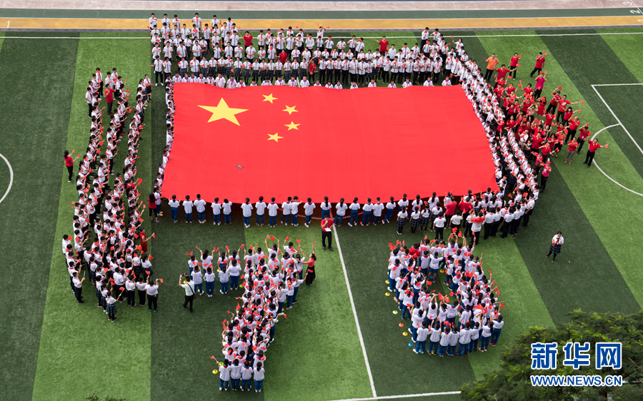 一面巨幅國旗在廣州市陳嘉庚紀(jì)念中學(xué)綠茵操場上格外引人注目(9月1日攝)。新華社發(fā)