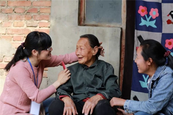 2016年4月11日,河北省邢臺市內(nèi)丘縣金店鎮(zhèn)韓郝莊村大學(xué)生“村官”田少微(左)在和孤寡老人聊天。