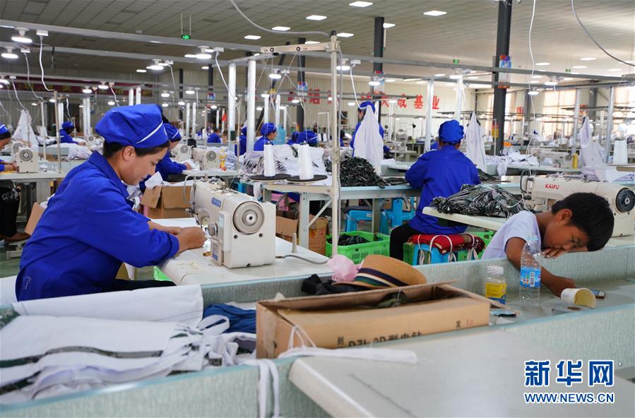 8月29日,在甘肅省臨夏回族自治州東鄉(xiāng)族自治縣達板鎮(zhèn)一扶貧車間,一名工人在車間制作衣服,她的兒子在一旁陪伴。 新華社記者 陳君清 攝