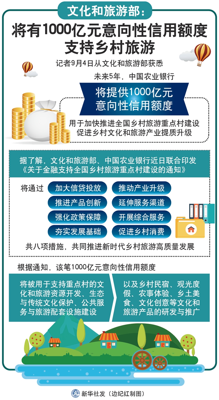 新華社北京9月4日電(記者余俊杰)記者4日從文化和旅游部獲悉,未來5年,中國農(nóng)業(yè)銀行將提供1000億元意向性信用額度,用于加快推進(jìn)全國鄉(xiāng)村旅游重點(diǎn)村建設(shè),促進(jìn)鄉(xiāng)村文化和旅游產(chǎn)業(yè)提質(zhì)升級(jí)。