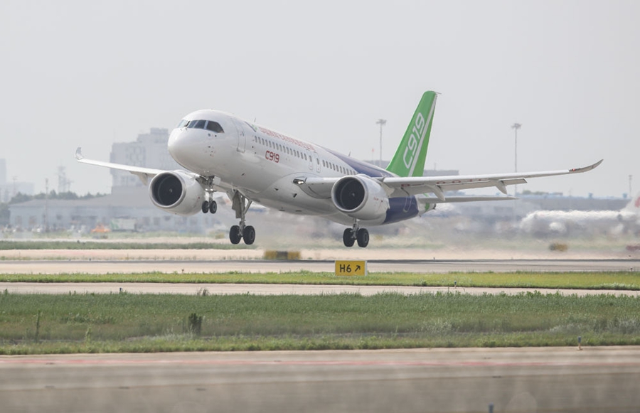 資料圖片:C919大型客機在上海浦東機場起飛。新華社記者 丁汀 攝