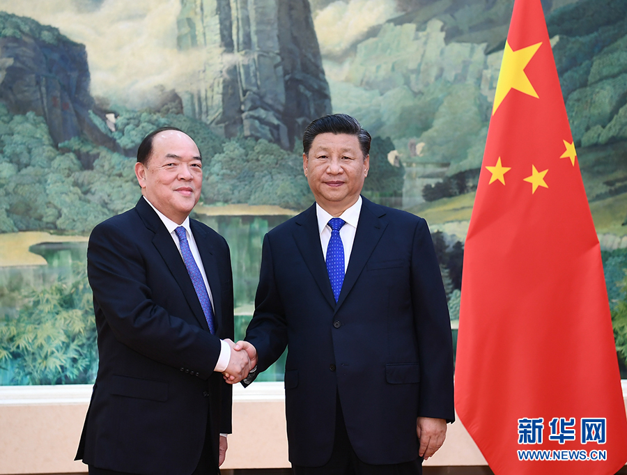 9月11日,國(guó)家主席習(xí)近平在人民大會(huì)堂會(huì)見(jiàn)新當(dāng)選并獲中央政府任命的澳門(mén)特別行政區(qū)第五任行政長(zhǎng)官賀一誠(chéng)。 新華社記者 謝環(huán)馳 攝