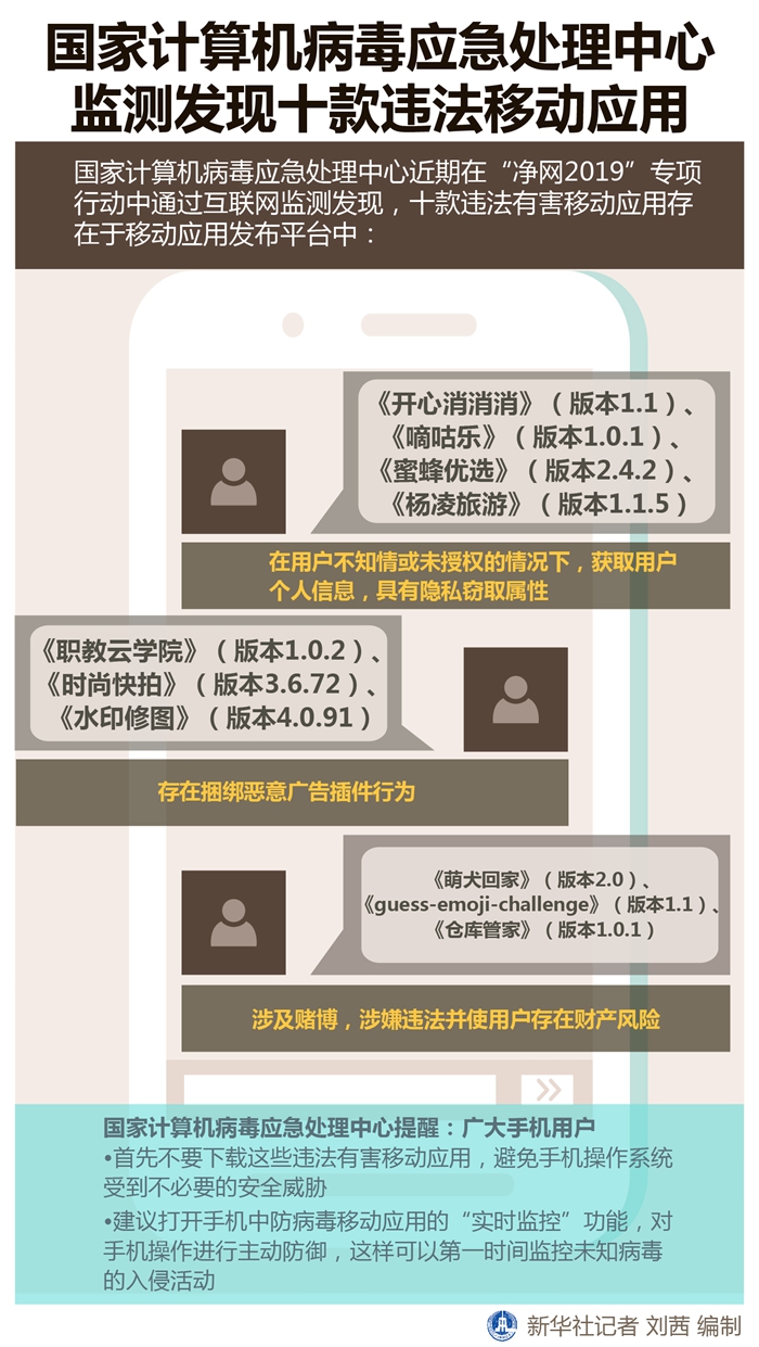 新華社天津9月15日電(記者張建新)國(guó)家計(jì)算機(jī)病毒應(yīng)急處理中心近期在“凈網(wǎng)2019”專項(xiàng)行動(dòng)中通過互聯(lián)網(wǎng)監(jiān)測(cè)發(fā)現(xiàn),十款違法有害移動(dòng)應(yīng)用存在于移動(dòng)應(yīng)用發(fā)布平臺(tái)中,其主要危害涉及隱私竊取、私自下載和賭博三類。這些違法有害移動(dòng)應(yīng)用具體如下: