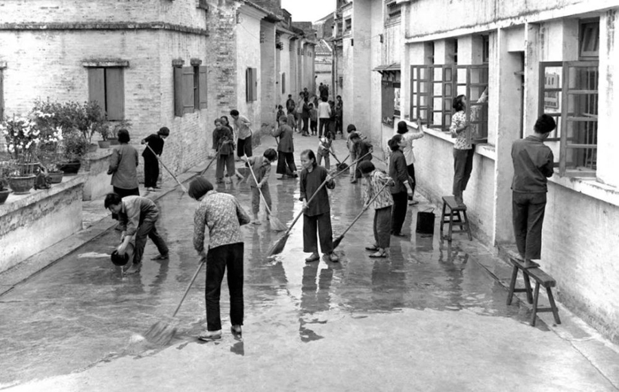 1966年1月17日,全國衛(wèi)生紅旗單位廣東省佛山市在春節(jié)前夕,又掀起一個愛國衛(wèi)生運動的高潮。圖為佛山市滘邊街居民在洗刷街道。(新華社記者李開遠 攝)