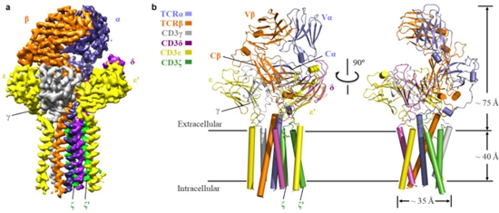對此,文章審稿人的評價是:“該研究工作代表了細胞適應性免疫的分子機理研究的一個重要里程碑。通過闡明第一個在膜上組裝的T細胞受體和其CD3共受體的結(jié)構(gòu),極大地增加了我們對T細胞識別抗原反應的激活機制的理解?!?/p>