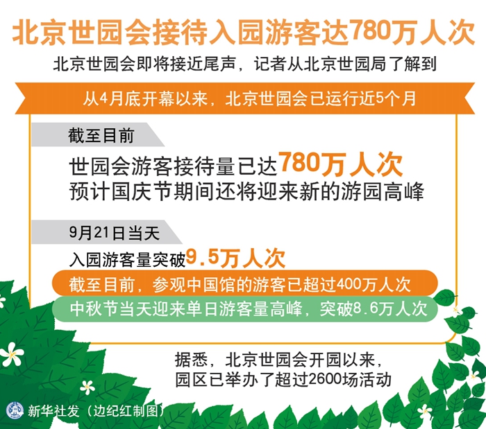 新華社北京9月23日電(魏夢(mèng)佳、王雪純)北京世園會(huì)即將接近尾聲,記者從北京世園局了解到,從4月底開幕以來,北京世園會(huì)已運(yùn)行近5個(gè)月,截至目前,世園會(huì)游客接待量已達(dá)780萬人次,預(yù)計(jì)國(guó)慶節(jié)期間還將迎來新的游園高峰。
