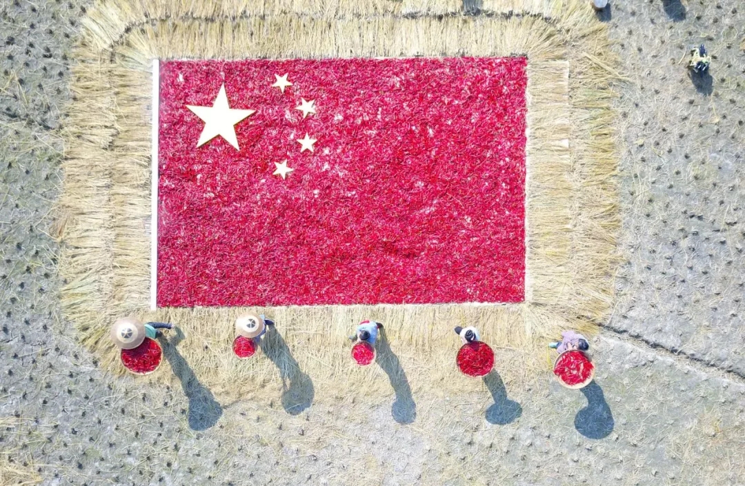 2019年9月30日,貴州凱里。舟溪鎮(zhèn)曼洞村的村民用辣椒拼出國旗圖案,以樸實的方式表達對祖國的熱愛和美好祝福。作者:紫氣東來