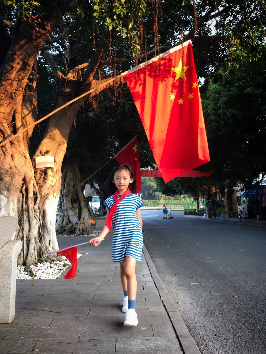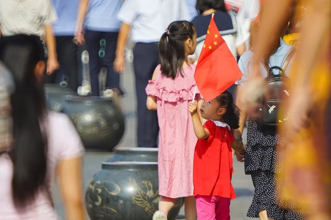 2019年10月1日,江西鷹潭。身著紅衣的小女孩回頭看了看和自己衣服一樣顏色的國旗。作者:咖喱給給