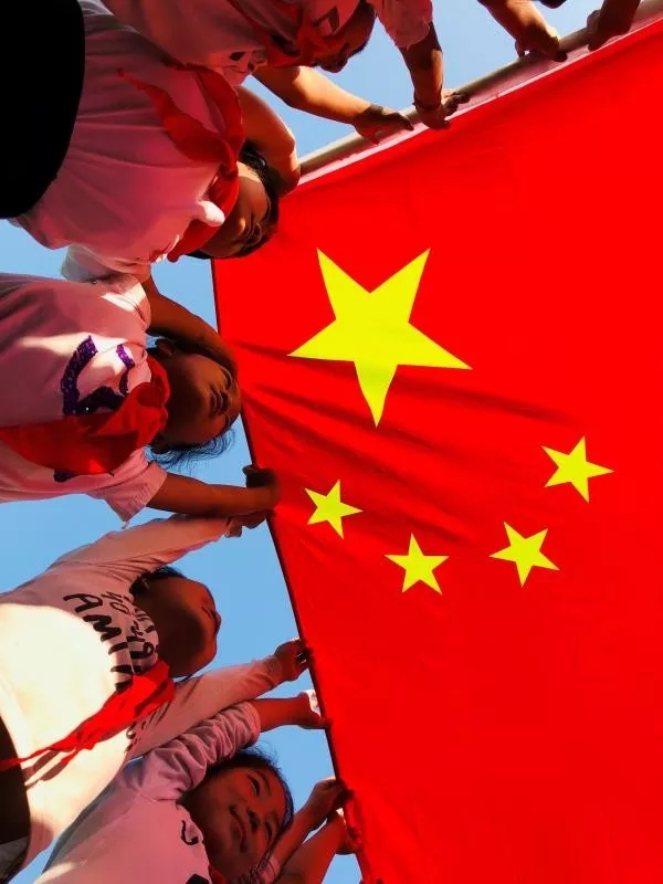 2019年9月28日,甘肅甘谷。幼兒園的小朋友歡快地揮動手中的五星紅旗,祝福祖國生日快樂!作者:草野沐風(fēng)