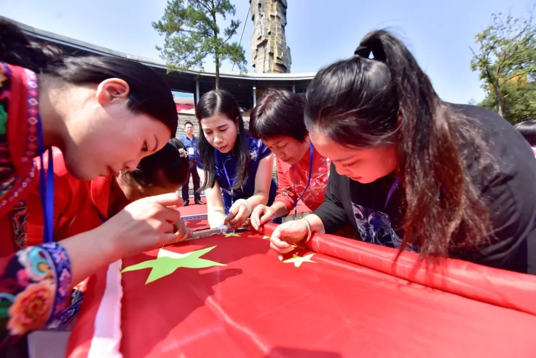 2019年9月28日,湖南張家界大峽谷景區(qū)。參加“壯麗七十年 繡出新時代”的武陵山(張家界)首屆刺繡大賽活動的評委們在比賽現(xiàn)場集體繡出一面鮮艷的五星紅旗。作者:歐小芳