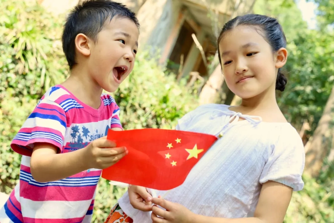 2019年10月1日,江蘇南京。姐姐給弟弟講國旗含義。作者:翡