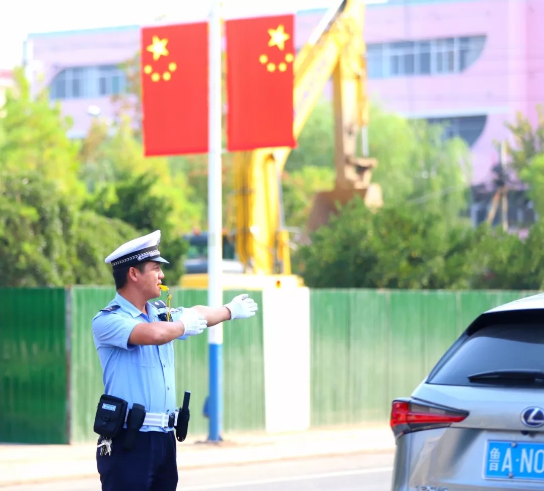 2019年9月30日,山東濟陽。國旗下,交通警察在指揮車輛行駛。作者:墨影耕耘——劉子平