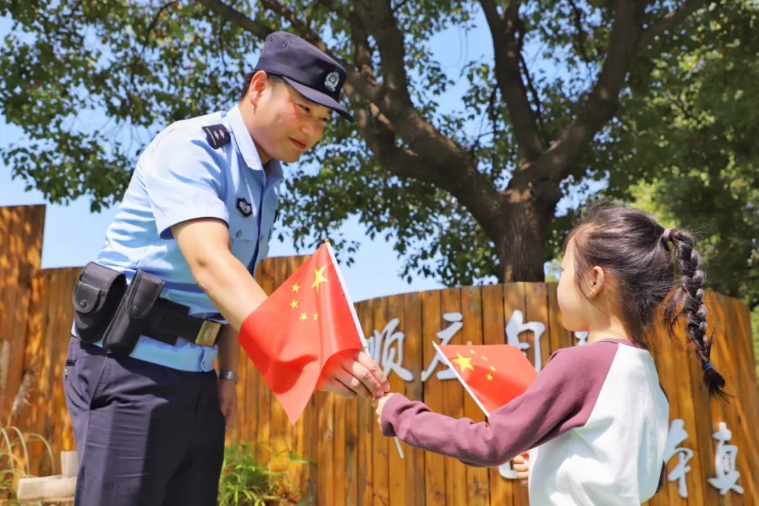 2019年9月23日,江蘇揚中。小朋友看到執(zhí)勤的警察叔叔,遞上了手中的國旗。作者:曉媛