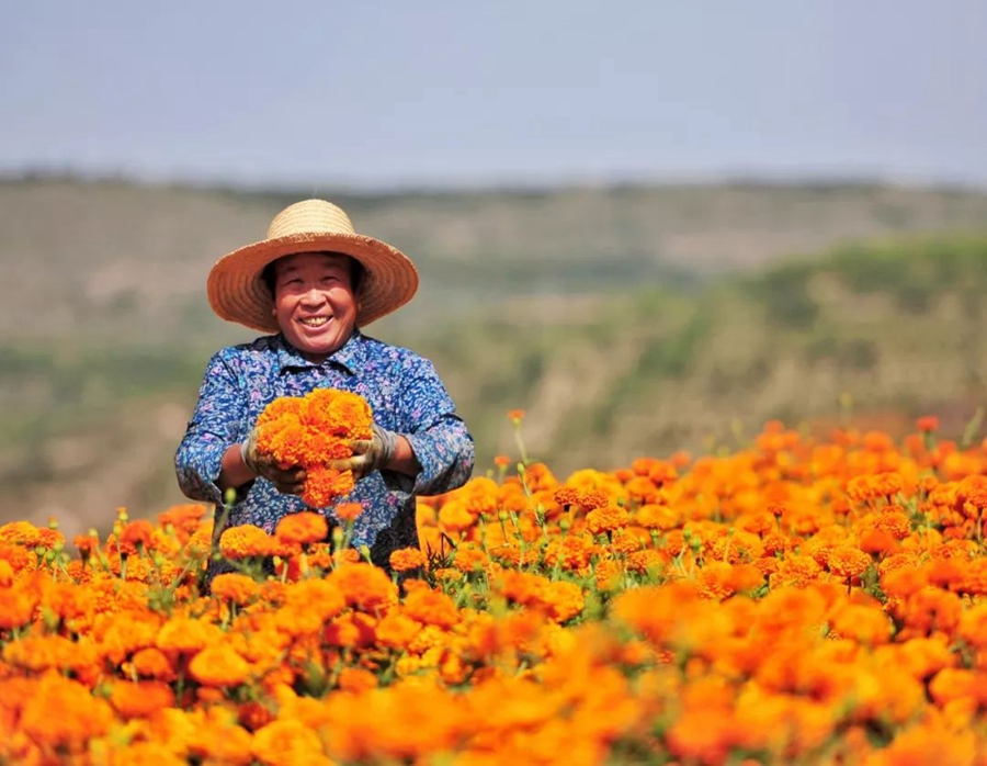 9月12日,寧夏彭陽。種植萬壽菊,不僅發(fā)展了旅游業(yè),也讓當(dāng)?shù)乩习傩者^上了好日子。作者:瑾