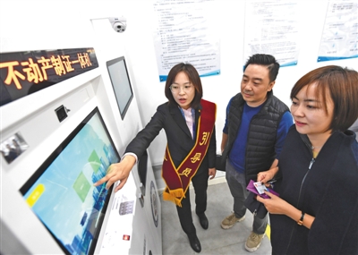 昨日,朝陽區(qū)不動產(chǎn)登記事務中心,工作人員講解不動產(chǎn)制證一體機的使用方法。 新京報記者 吳寧 攝