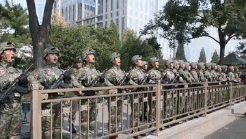 彼時(shí),當(dāng)載有女排隊(duì)員的花車駛過,結(jié)束受閱的官兵們?cè)诼放札R聲喊出“中國(guó)女排,世界第一”。
