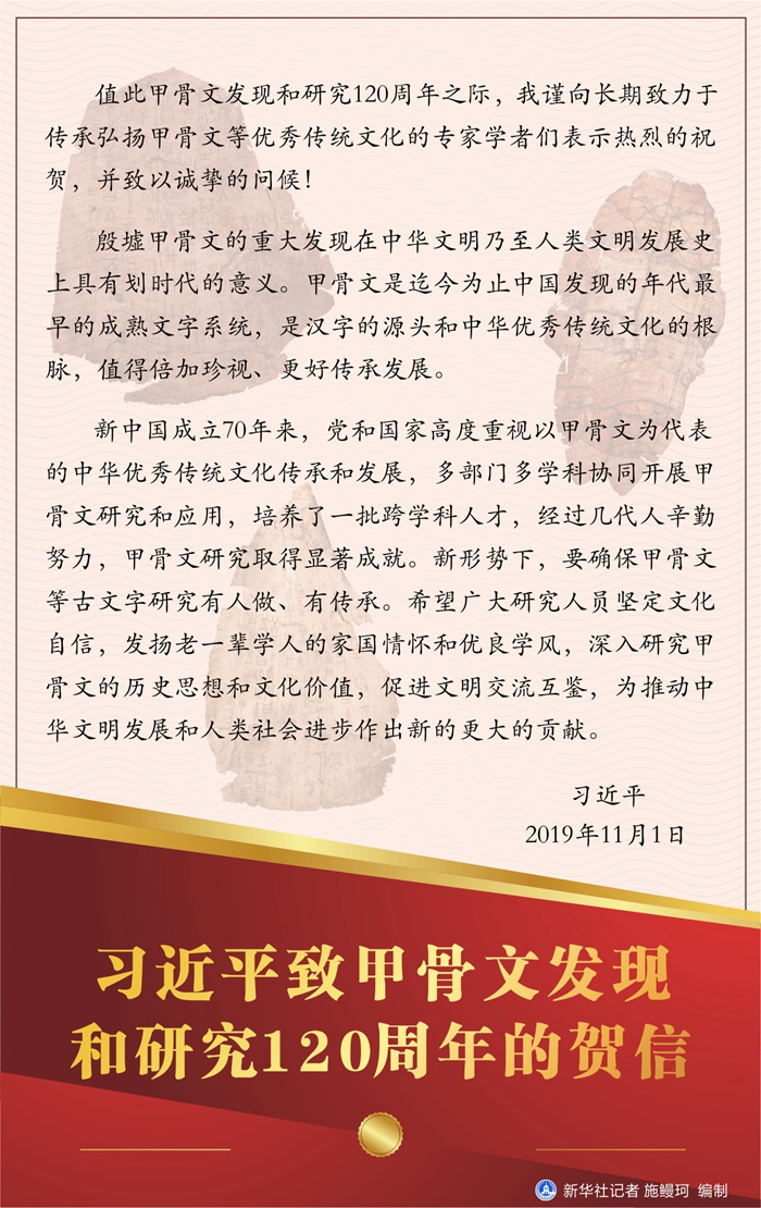 圖表:習近平致甲骨文發(fā)現(xiàn)和研究120周年的賀信 新華社記者 施鰻珂 編制