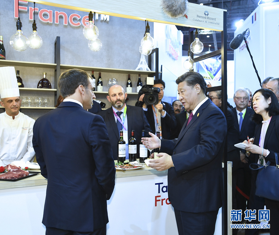 習(xí)近平在法國總統(tǒng)馬克龍陪同下首先來到法國館。馬克龍熱情邀請習(xí)近平品嘗法國紅酒和牛肉食品。在場法國企業(yè)家爭先恐后向習(xí)近平表示,法國企業(yè)看好中國市場,希望進(jìn)一步擴大對華出口。習(xí)近平指出,中國消費市場很大,可以滿足不同層次的多樣化需求,希望法國企業(yè)家展現(xiàn)長遠(yuǎn)眼光,同中國加強互利合作。