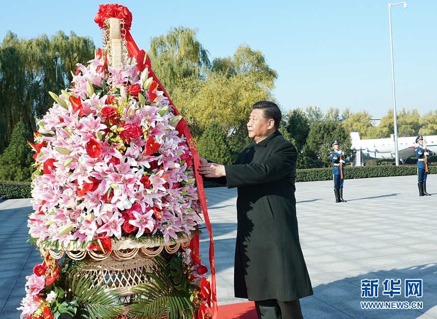 11月8日,中共中央總書記、國家主席、中央軍委主席習近平出席慶祝空軍成立70周年主題活動,代表黨中央和中央軍委,對空軍成立70周年表示熱烈祝賀,向空軍全體官兵致以誠摯問候。這是習近平來到位于北京市昌平區(qū)的中國航空博物館,向人民空軍英烈敬獻花籃。 新華社記者 李剛 攝