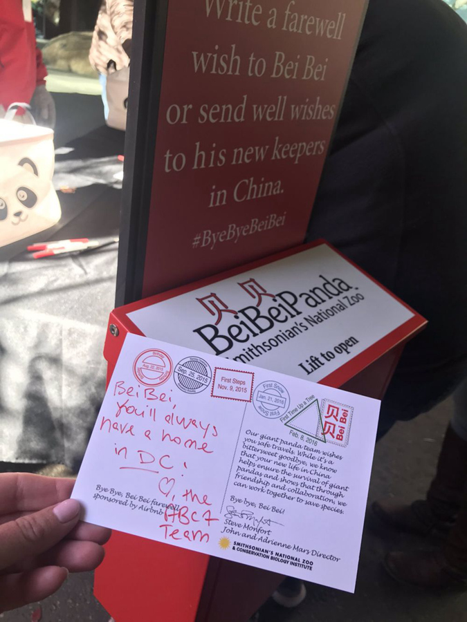 工作人員還在熊貓館外設(shè)立了一處臨時明信片中心。老老少少都在明信片上寫下給“貝貝”的祝福。據(jù)介紹,這些明信片也會一同送到中國。