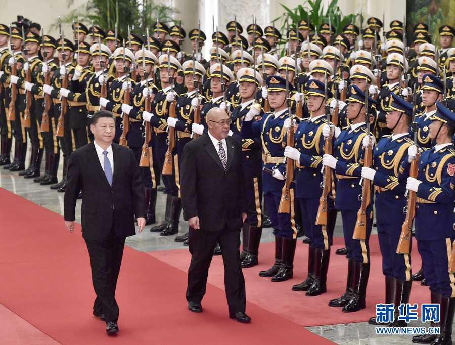 11月27日,國家主席習(xí)近平在北京人民大會堂同蘇里南總統(tǒng)鮑特瑟會談。這是會談前,習(xí)近平在人民大會堂北大廳為鮑特瑟舉行歡迎儀式。 新華社記者 龐興雷 攝
