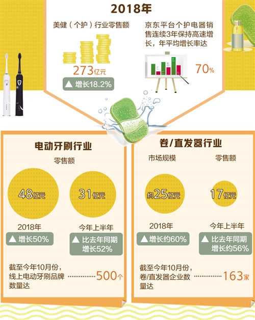 中國(guó)家用電器協(xié)會(huì)美?。▊€(gè)護(hù))電器專業(yè)委員會(huì)調(diào)查數(shù)據(jù)顯示,2018年美?。▊€(gè)護(hù))行業(yè)零售額273億元,增長(zhǎng)18.2%。今年上半年,電動(dòng)剃須刀、電吹風(fēng)、卷/直發(fā)器和電動(dòng)牙刷4個(gè)品類零售額增速近40%;其中,卷/直發(fā)器和電動(dòng)牙刷兩類產(chǎn)品零售額增速是亮點(diǎn),均超過(guò)50%,市場(chǎng)正處于成長(zhǎng)期。