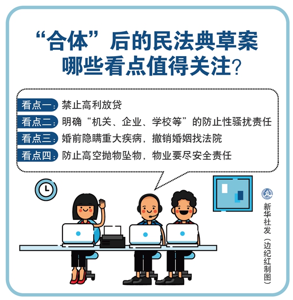 從明確禁止高利放貸、進一步完善防止性騷擾有關規(guī)定,到合理確定無效婚姻的情形、完善高空拋物墜物責任規(guī)則,民法典草案的諸多新看點值得關注。