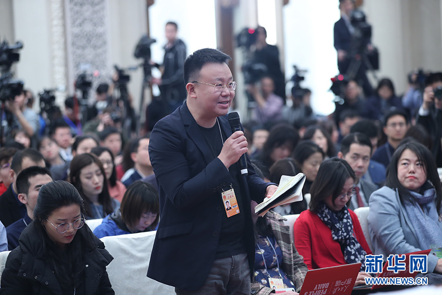十三屆全國(guó)人大二次會(huì)議3月4日上午11時(shí)15分在人民大會(huì)堂新聞發(fā)布廳舉行新聞發(fā)布會(huì),由大會(huì)發(fā)言人就大會(huì)議程和人大工作相關(guān)的問題回答中外記者提問。圖為封面新聞?dòng)浾咛釂?。新華網(wǎng)/中國(guó)政府網(wǎng) 陳杰 攝