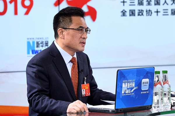 3月6日,全國(guó)人大代表、四川省生態(tài)環(huán)境廳黨組書記、廳長(zhǎng)于會(huì)文作客新華網(wǎng)2019全國(guó)兩會(huì)特別報(bào)道。新華網(wǎng) 李相博 攝