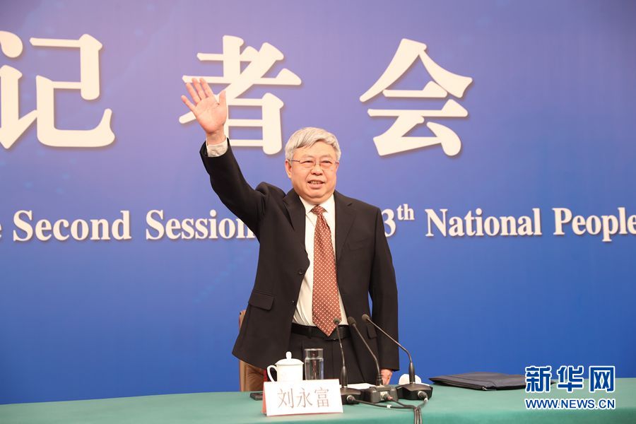 十三屆全國人大二次會議新聞中心于3月7日10時50分在梅地亞中心新聞發(fā)布廳舉行記者會,邀請國務院扶貧開發(fā)領導小組辦公室主任劉永富就“攻堅克難——堅決打贏脫貧攻堅戰(zhàn)”相關問題回答中外記者提問。圖為劉永富向記者們揮手示意。新華網(wǎng) 陳杰 攝