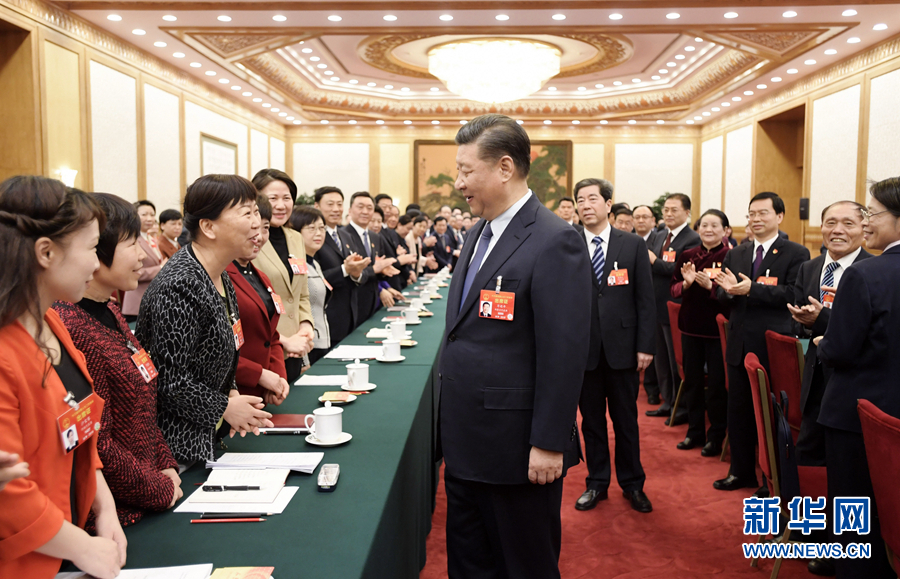 3月8日,中共中央總書記、國家主席、中央軍委主席習(xí)近平參加十三屆全國人大二次會議河南代表團的審議。在“三八”國際勞動婦女節(jié)到來之際,習(xí)近平代表黨中央,向參加全國兩會的女代表、女委員、女工作人員,向全國各族各界婦女,致以節(jié)日的祝賀和美好的祝福。這是習(xí)近平同女代表親切交談。新華社記者 李學(xué)仁 攝