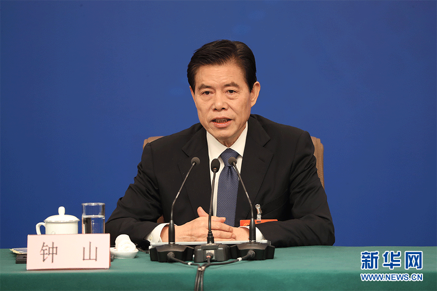 十三屆全國人大二次會議新聞中心3月9日(星期六)10時30分在梅地亞中心新聞發(fā)布廳舉行記者會,邀請商務(wù)部部長鐘山、副部長兼國際貿(mào)易談判副代表王受文、副部長錢克明就“促進(jìn)形成強大國內(nèi)市場 推動全方位對外開放”相關(guān)問題回答中外記者提問。圖為商務(wù)部部長鐘山。新華網(wǎng)/中國政府網(wǎng) 陳杰 攝