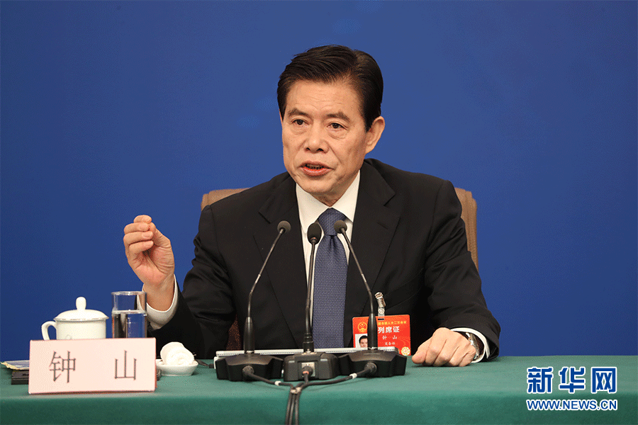 十三屆全國人大二次會議新聞中心3月9日(星期六)10時30分在梅地亞中心新聞發(fā)布廳舉行記者會,邀請商務部部長鐘山、副部長兼國際貿易談判副代表王受文、副部長錢克明就“促進形成強大國內市場 推動全方位對外開放”相關問題回答中外記者提問。圖為商務部部長鐘山。新華網/中國政府網 陳杰 攝