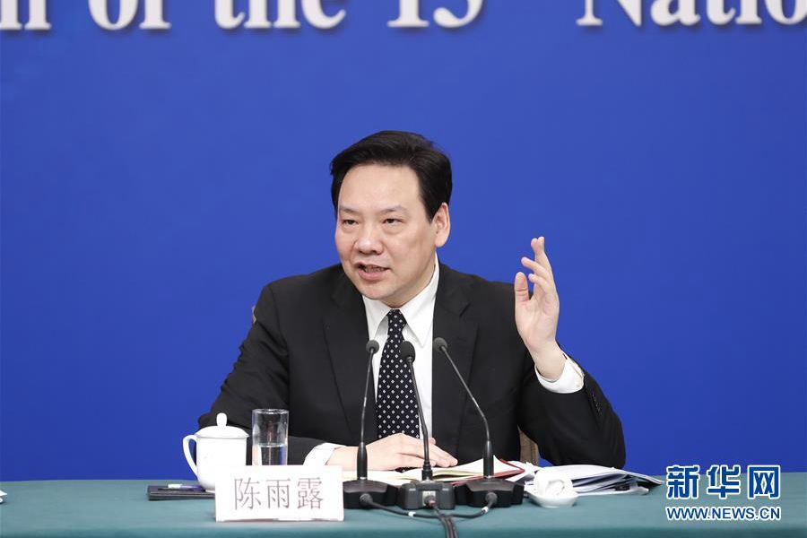 3月10日,十三屆全國人大二次會議新聞中心舉行記者會,邀請中國人民銀行行長易綱,副行長陳雨露,副行長、國家外匯管理局局長潘功勝,副行長范一飛就“金融改革與發(fā)展”相關(guān)問題回答中外記者提問。這是陳雨露在回答記者提問。新華社記者 沈伯韓 攝